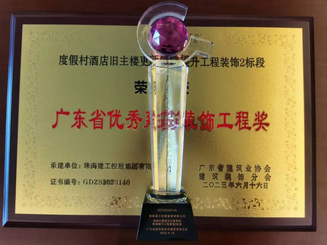 度假村酒店舊主樓更新修繕提升工程裝飾2標(biāo)段榮獲全國(guó)建筑工程裝飾獎(jiǎng)、廣東省優(yōu)秀建筑裝飾工程獎(jiǎng)、珠海市優(yōu)秀建筑裝飾工程獎(jiǎng)。