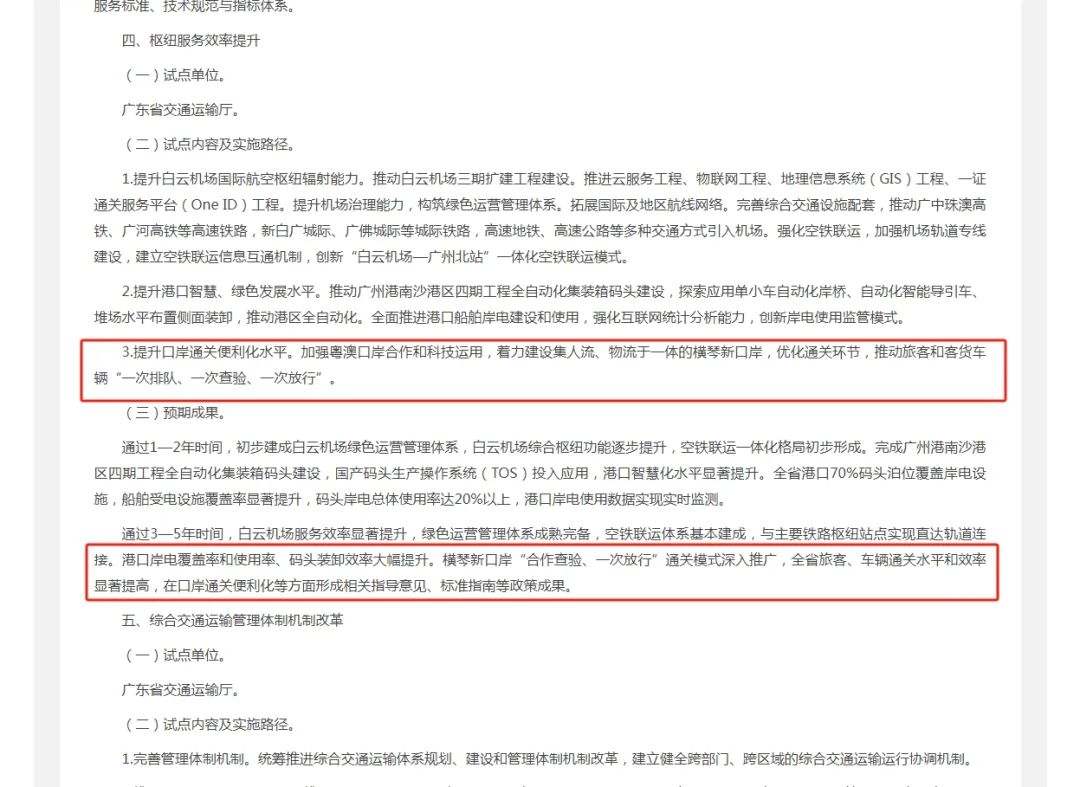 預(yù)期通過3—5年時(shí)間,實(shí)現(xiàn)白云機(jī)場服務(wù)效率顯著提升,綠色運(yùn)營管理體系成熟完備,空鐵聯(lián)運(yùn)體系基本建成,與主要鐵路樞紐站點(diǎn)實(shí)現(xiàn)直達(dá)軌道連接;港口岸電覆蓋率和使用率、碼頭裝卸效率大幅提升;橫琴口岸“合作查驗(yàn)、一次放行”通關(guān)模式深入推廣,全省旅客、車輛通關(guān)水平和效率顯著提高,在口岸通關(guān)便利化等方面形成相關(guān)指導(dǎo)意見、標(biāo)準(zhǔn)指南等政策成果。